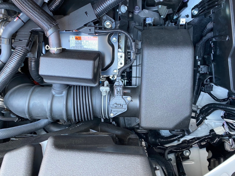 The air cleaner box(air filter cavity) is located near the engine itself and is shaped like a box with a hose-like air duct.